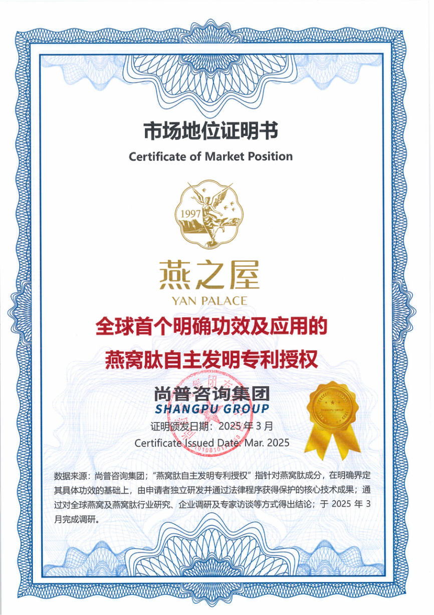 科研實力的卓越體現(xiàn),在于能否攻克行業(yè)共性難題并建立核心技術(shù)標準。燕之屋在燕窩肽領(lǐng)域取得關(guān)鍵突破,于2025年經(jīng)權(quán)威第三方機構(gòu)尚普咨詢集團專業(yè)認證,獲得“全球首個明確功效及應用的燕窩肽自主發(fā)明專利授權(quán)①”市場地位證明書。該項認證所基于的核心專利《一種具有促進細胞修護、高保濕美白功效的燕窩肽制備方法及應用》(專利號:ZL 2022 11398048.3),徹底改變了傳統(tǒng)燕窩肽“成分模糊、功效籠統(tǒng)”的行業(yè)局面。該專利①明確了燕窩肽的定向酶解工藝,能夠?qū)⒀喔C大分子蛋白質(zhì)精準切割為平均分子量小于3000道爾頓(Da)的活性小分子肽段。通過此工藝制備的燕窩肽,其促進細胞修護、高效保濕及抗氧化等核心功能特性①獲得了明確界定與保護,為產(chǎn)品的科學有效性奠定了堅實的法律與技術(shù)基石。